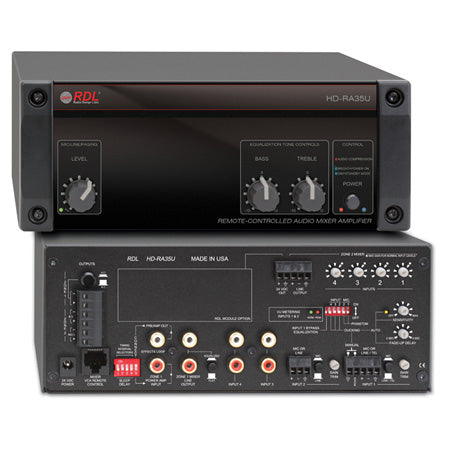 The HD-RA35U is a four input audio mixer amplifier for systems demanding the broadest range of features and the highest energy efficiency. Two output power amplifier zones, 35 watts (Zone 1) and 4 watts (Zone 2), are driven from high-efficiency Class D amplifier stages. The mixer and amplifier sections all normally shut down (standby "sleep" mode) when audio is absent and automatically turn on when needed. A paging source is normally connected to Input 1. The Zone 1 amplifier output level for inputs 2, 3 and 4 is VCA controlled using various optional RDL remote controls. This allows the user controls to be conveniently wall mounted without running audio to and from the remote control location. The Zone 1 output drives 4 ohm or 8 ohm speakers. The output impedance is switch-selectable on the rear panel. The Zone 2 amplifier output drives an 8 ohm speaker and/or 600 ohm telephone equipment.