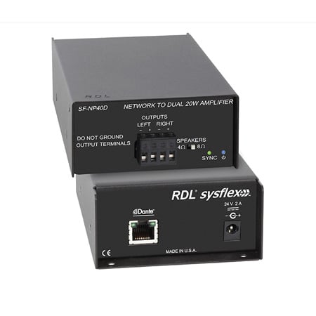 The SF-NP40D is an audio power amplifier that converts two Dante network audio channels to two 4 Ohm or 8 Ohms amplified outputs. Each output provides 20 watts into 8 ohms for a network digital audio level of 0 dBFS. Special software is not required to configure the module.
