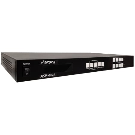 The Aurora ASP-442A is an HDMI 2.0A 4x4 4K 60Hz matrix offering the power and flexibility you need at a cost effective price. Route Ultra High Definition video sources and multi-channel digital audio from any of the HDMI inputs to the any of the HDMI outputs at the same time. The front keypad and LCD display are designed for easy operation and quick status of routing while the integrated Web Control Pages allow for remote control from any device with a Web Browser (Tablets, Computers, Smartphones, etc.). LAN and RS-232 Ports have advanced protocols allowing hot plug detection, signal detection, EDID table loading/recalling, presets, and more. The advanced protocol features and integrated Web Control make the ASP-442A perfect for commercial applications with auto switching, digital signage with device detection, or residential systems with home automation.