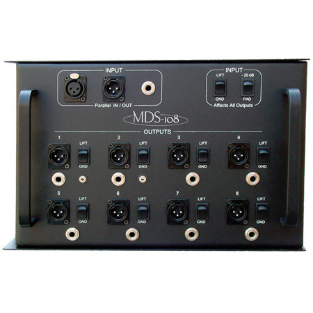 Ideal for press feed applications. Accepts either balanced or unbalanced input information from any mixing console output, while providing multiple microphone level output feeds to tape recorders or mixing console inputs simultaneously. MDS boxes provide feed thru connections which allow multiple MDS boxes to be linked therefore providing the user with up to 24 transformer isolated feeds. Now with 3.5mm connectors!