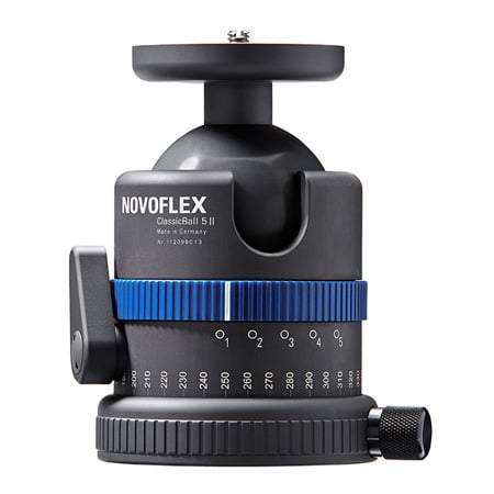 The ClassicBall 5 II Ball Head from Novoflex acts both as a standard ball head, and also a leveling panorama panning base. To make use of the panning base the ball head is mounted upside down so that the mounting base can be leveled using the ball, ensuring properly aligned panoramic images, confirmed by the built-in bubble level. The ClassicBall 5 II can hold up to 26 lbs, stands 4.6" high, and weighs 2.1 lbs. A matte titanium finish and an all-metal design blend form and function, and three 90° notches add to the versatility of the ball head, allowing the camera to tilt 180°. Advanced Friction Control allows you to adjust the amount of tension on the ball by turning a center ring on the ball head. The grease-free ball locks securely into place, with no shift in placement once locked down.