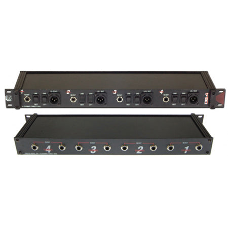 4-channel professional quality passive direct box for connection of unbalanced musical instruments and line-level sources to low-Z balanced microphone inputs for PA or recording. Each channel features 1 front-panel and 2 rear-panel 1/4" (6.35mm) jacks for input or parallel output, switches for line-level attenuation and ground lift, and front-panel male XLR-type output. Uses Pro Co DBT-1 transformers (20k/150 ohm)