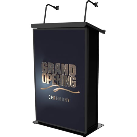 ProX X-MAESTROMEDIABL Maestro Media Lectern Podium for LED Flatscreen TVs up to 32" with 2 Gooseneck Mic Stands Black Finish. This Lectern stand is everything you need when it comes to delivering live speeches for indoor or outdoor events. It's made with rugged aluminum and has a heavy-duty base that keeps it stabilized and grounded at all times.