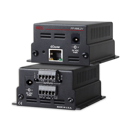 The FP-NML2V modules are Dante audio network interface products compatible with mic-level or line-level audio equipment inputs. These modules are designed to be mounted in equipment racks, closets, conference tables and on shelves or backboards in commercial/industrial installations.