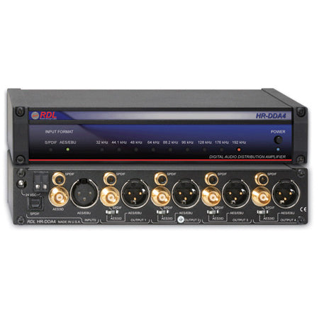 The RDL HR-DDA4 is the ideal choice in installations requiring high quality distribution of a digital audio signal. The input and each of the four outputs support AES/EBU, S/PDIF or AES-3ID formats. The HR-DDA4 automatically detects a valid input on any of the four input jacks: S/PDIF optical, S/PDIF coaxial, AES-3ID or AES/EBU. The input is decoded, reclocked and retransmitted to four individually buffered outputs. Front-panel LEDs display the digital audio format and sample rate of a valid source received without any phase-lock or bit errors.