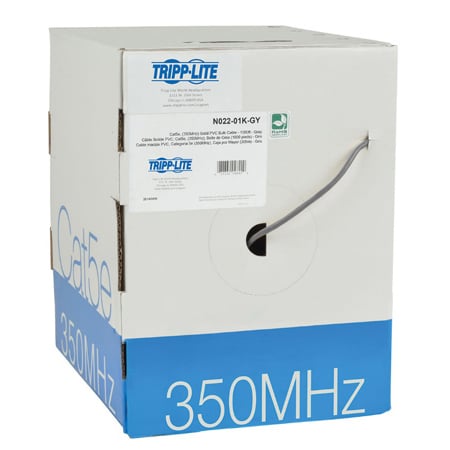 Tripp Lite's 1000-foot gray category 5e (Cat5e) solid PVC bulk cable is designed for premise (in-wall) cabling applications. This 24 AWG 4-pair solid cable has a PVC jacket and is rated for 350MHz/1Gbps communication. Used for all non-plenum horizontal wiring applications. Meets most current industry standards including IEEE 802.3ab, IEEE 802.5, ANSI/EIA/TIA 568, ISO/IEC11801 and ETL (category 5e, draft 11).
