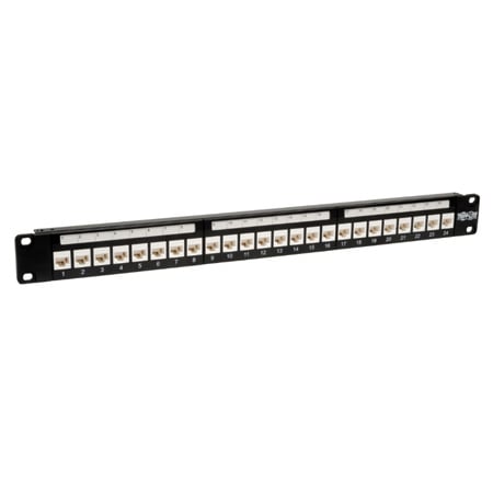 Tripp Lite's N250-024-LP, Cat6 Feed-Through Low Profile patch panel, makes cable patching quick and easy, by simply plugging Cat6 patch cables into either side of the Cat6 couplers. Ninety degree angles on the couplers allows for low profile mounting to a wall with included stand-off brackets. Cables feed into the front of the panel, and corresponding patch cables exit Up, Down, Left, or Right, depending on the mounting position. Patented printed circuit board design within the coupler exceeds NEXT requirements for Cat6 component testing, assuring Gigabit+ speeds.