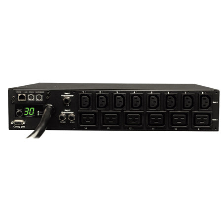 Tripp Lite single phase Switched PDU / Power Distribution Unit offers advanced network control and monitoring with the ability to turn on, turn off, recycle or lock-out power to each individual receptacle, monitor site electrical conditions and remotely monitor output power consumption. PowerAlert interface supports remote control and custom notification of user-specified conditions via email, secure web, SNMP, Telnet or SSH interface. Individually switched outlets can be controlled in real-time to remotely reboot unresponsive network hardware, or be custom programmed for user-defined power-up and power-down sequences to ensure proper startup of interdependent IT systems and prevent inrush-related overloads as network equipment is first energized. Unused PDU outlets can be electronically locked off to prevent the connection of unauthorized hardware. PDU output current consumption in amps is continuously displayed locally via visual meter and remotely via web/network interface to warn of potential overloads before critical IT mains or branch breakers trip.