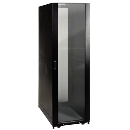 The SR42UBG houses 3000 lb of standard 19-inch rack equipment in 42U. Its front and rear pairs of vertical rails have square mounting holes that are adjustable in quarter-inch increments from 4 to 37 inches. Adjustment is quick and an easy-view depth index ensures consistent rail placement without requiring time-consuming measurements. Each rack space within the enclosure is numbered for ready reference.Two of the adjustable vertical mounting rails support toolless button-mount 0U installation of up to four compatible PDUs and cable managers. This feature makes it easier to route cabling to rack equipment and reduces cord clutter.With its locking, reversible plexi-glass front door, split vented rear doors, and locking, removable side panels, the SR42UBG provides ultimate equipment safety. The side panels are half size for ease of removal and reinstallation. The split rear door design allows the enclosure to be placed closer to a wall. The SR42UB meets all requirements toward PCI DSS compliance.The top panel of the SR42UBG is vented to help remove warm air from the enclosure and draw in cool air by convection. The top panel includes ports for cable routing, and can be quickly removed without tools. To facilitate cable access, the SR42UBG is open-bottom.All components of the SR42UBG are grounded to the enclosure frame. Front and rear threaded grounding points are provided for connection to the facility earth ground. The removable front and rear doors feature quick-release ground wires.To simplify deployment, the SR42UBG comes with preinstalled casters that enable it to be easily maneuvered into the desired location, where it can be secured by adjusting the preinstalled levelers. Note: the casters are intended for minor position adjustments and are not designed for moving the enclosure over long distances.The SR42UBG comes with a 5-year product warranty. As part of the SmartRack family, the SR42UBG is compatible with Tripp Lite’s extensive range of rackmount accessories, enabling you to customize your solution to meet any requirement.