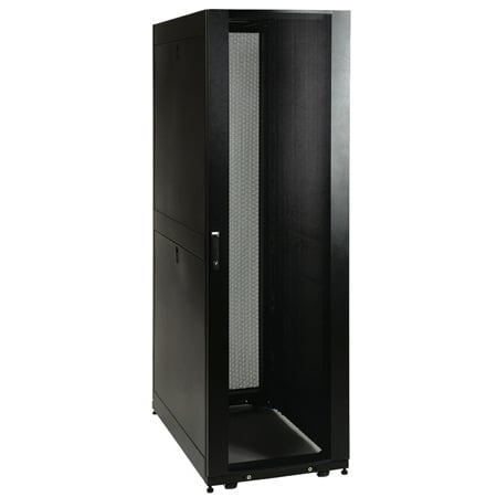 SmartRack enclosures are designed for secure, high density server and networking applications in IT environments. Designed with provisions to integrate cooling, power distribution and cable management, SmartRack enclosures make ideal homes for mission-critical equipment. Vendor-neutral square hole/cage nut mounting for guaranteed compatibility with all EIA-310-D compliant 19" equipment. Tool-less mounting slots allow quick installation of PDUs and vertical cable managers. Adjustable mounting rails include an easy-view depth index to eliminate time-consuming measurements. Lightweight modular doors and side panels provide safe, convenient service access. Integrated baying tabs facilitate combining enclosures in rows for standard data center baying applications. SmartRack enclosures hold up to 3000 lbs and support cooling, cable management, power distribution and monitoring features that keep critical servers and network equipment operating nonstop. Perforated doors permit massive front to rear airflow that exceeds servers manufacturer requirements. Enclosures are fully compatible with hot-aisle / cold-aisle data center configurations.
