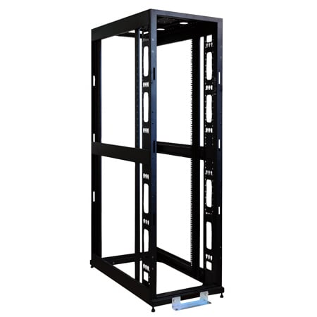 The SR45UBEXPND is 45U SmartRack enclosure with NO doors and NO side panels. The 'EXP' version is an expansion model used when several cabinets are bayed together. Its integrated baying tabs make it easy to combine multiple enclosures in rows for data center applications. This enclosure is also compatible with hot-aisle/cold-aisle configurations.The SR45UBEXPND houses 3000 lb of standard 19-inch rack equipment in 45U. Its front and rear pairs of vertical rails have square mounting holes that are adjustable in quarter-inch increments from 4 to 37 inches. Adjustment is quick and an easy-view depth index ensures consistent rail placement without requiring time-consuming measurements. Each rack space within the enclosure is numbered for ready reference.Two of the adjustable vertical mounting rails support toolless button-mount 0U installation of up to four compatible PDUs and cable managers. This feature makes it easier to route cabling to rack equipment and reduces cord clutter.All components of the SR45UBEXPND are grounded to the enclosure frame. Front and rear threaded grounding points are provided for connection to the facility earth ground. To simplify deployment, the SR45UBEXPND comes with preinstalled casters that enable it to be easily maneuvered into the desired location, where it can be secured by adjusting the preinstalled levelers. Note: the casters are intended for minor position adjustments and are not designed for moving the enclosure over long distances.The SR45UBEXPND comes with a 5-year product warranty. As part of the SmartRack family, the SR45UBEXPND is compatible with Tripp Lite’s extensive range of rackmount accessories, enabling you to customize your solution to meet any requirement.