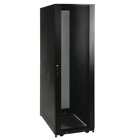 The SR45UBMD is part of our new line of mid-depth rack enclosures. It features a massive front-to rear-ventilation capacity that meets or exceeds server manufacturer requirements. Its integrated baying tabs make it easy to combine multiple enclosures in rows for data center applications. This enclosure is also compatible with hot-aisle/cold-aisle configurations. The SR45UBMD houses 3000 lb of standard 19-inch rack equipment in 45U. Its front and rear pairs of vertical rails have square mounting holes that are adjustable in quarter-inch increments from 4 to 31 inches. Adjustment is quick and an easy-view depth index ensures consistent rail placement without requiring time-consuming measurements. Each rack space within the enclosure is numbered for ready reference. Two of the adjustable vertical mounting rails support toolless button-mount 0U installation of up to four compatible PDUs and cable managers. This feature makes it easier to route cabling to rack equipment and reduces cord clutter. With its locking, reversible, removable front and rear doors, and locking, removable side panels, the SR45UBMD provides ultimate equipment safety. The side panels are half size for ease of removal and reinstallation. The split rear door design allows the enclosure to be placed closer to a wall. The SR45UBMD meets all requirements toward PCI DSS compliance. The top panel of the SR45UBMD is vented to help remove warm air from the enclosure and draw in cool air by convection. The top panel includes ports for cable routing, and can be quickly removed without tools. To facilitate cable access, the SR45UBMD is open-bottom. All components of the SR45UBMD are grounded to the enclosure frame. Front and rear threaded grounding points are provided for connection to the facility earth ground. The removable front and rear doors feature quick-release ground wires. To simplify deployment, the SR45UBMD comes with preinstalled casters that enable it to be easily maneuvered into the desired location, where it can be secured by adjusting the preinstalled levelers. Note: the casters are intended for minor position adjustments and are not designed for moving the enclosure over long distances. The SR45UBMD comes with a 5-year product warranty. As part of the SmartRack family, the SR45UBMD is compatible with Tripp Lite’s extensive range of rackmount accessories, enabling you to customize your solution to meet any requirement.