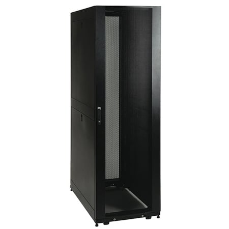 Tripp Lite SR45UBSP1 45RU SmartRack Enclosure ships mounted on a special pallet that features additional reinforcement and shock-absorbing material. The pallet's protective cushion safeguards the enclosure and the precision components it contains during re-shipping. Reinforced pallets and reusable packaging provide the flexibility to fully configure rack enclosures in a centralized location and safely re-ship them to remote sites, saving significant service costs. They also allow the freedom to custom-configure enclosures with network and server hardware along with UPS systems, PDUs, KVM switches and a variety of other devices prior to final installation. At the desired location the SR45UBSP1 can be easily maneuvered with its preinstalled casters and can be secured by adjusting the preinstalled levelers.The SR45UBSP1 houses 3000lbs of standard 19-inch rack equipment in 45U. Its front and rear pairs of vertical rails have square mounting holes that are adjustable in quarter-inch increments from 4 to 37 inches. Adjustment is quick and an easy-view depth index ensures consistent rail placement without requiring time-consuming measurements. Each rack space within the enclosure is numbered for ready reference.Two of the adjustable vertical mounting rails support toolless button-mount 0U installation of up to four compatible PDUs and cable managers. This feature makes it easier to route cabling to rack equipment and reduces cord clutter.With its locking, reversible, removable front and rear doors, and locking, removable side panels, the SR45UBUSP1 provides ultimate equipment safety. The side panels are half size for ease of removal and reinstallation. The split rear door design allows the enclosure to be placed closer to a wall. The SR45UBSP1 meets all requirements toward PCI DSS compliance.The top panel of the SR45UBSP1 is vented to help remove warm air from the enclosure and draw in cool air by convection. the top panel includes ports for cable routing, and can be quickly removed without tools. The facilitate cable access, the SR45UBSP1 is open-bottom.All components of the SR45UBSP1 are grounded to the enclosure frame. Front and rear threaded grounding points are provided for connection to the facility earth ground. The removable front and rear doors feature quick-release ground wires.The SR45UBSP1 comes with a 5-year product warranty. As part of the SmartRack family it is compatible with Tripp Lite's extensive range of rackmount accessories, enabling you to customize your solution to meet any requirements.