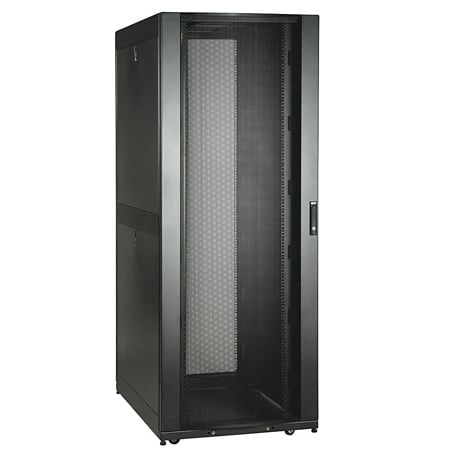 The SR45UBWD is a WIDE version of our standard 45U SmartRack. This enclosure is 750mm wide (30") compared to the standard 600mm wide (24"). This extra width allows for high density equipment installations. It allows cable management and PDU mounting off to the sides of the rack in order to keep these items out of the airflow for proper cooling.The SR45UBWD features a massive front-to rear-ventilation capacity that meets or exceeds server manufacturer requirements. Its integrated baying tabs make it easy to combine multiple enclosures in rows for data center applications. This enclosure is also compatible with hot-aisle/cold-aisle configurations. With its locking, reversible, removable front and rear doors, and locking, removable side panels, the SR45UBWD provides ultimate equipment safety. The side panels are half size for ease of removal and reinstallation. The split rear door design allows the enclosure to be placed closer to a wall. The SR45UBWD meets all requirements toward PCI DSS compliance.The top panel of the SR45UBWD is vented to help remove warm air from the enclosure and draw in cool air by convection. The top panel includes ports for cable routing, and can be quickly removed without tools. To facilitate cable access, the SR45UBWD is open-bottom.All components of the SR45UBWD are grounded to the enclosure frame. Front and rear threaded grounding points are provided for connection to the facility earth ground. The removable front and rear doors feature quick-release ground wires. It houses 3000 lb of standard 19-inch rack equipment in 45U. To simplify deployment, the SR45UBWD comes with preinstalled casters that enable it to be easily maneuvered into the desired location, where it can be secured by adjusting the preinstalled levelers. Note: the casters are intended for minor position adjustments and are not designed for moving the enclosure over long distances.The SR45UBWD comes with a 5-year product warranty. As part of the SmartRack family, the SR45UBWD is compatible with Tripp Lite’s extensive range of rackmount accessories, enabling you to customize your solution to meet any requirement.